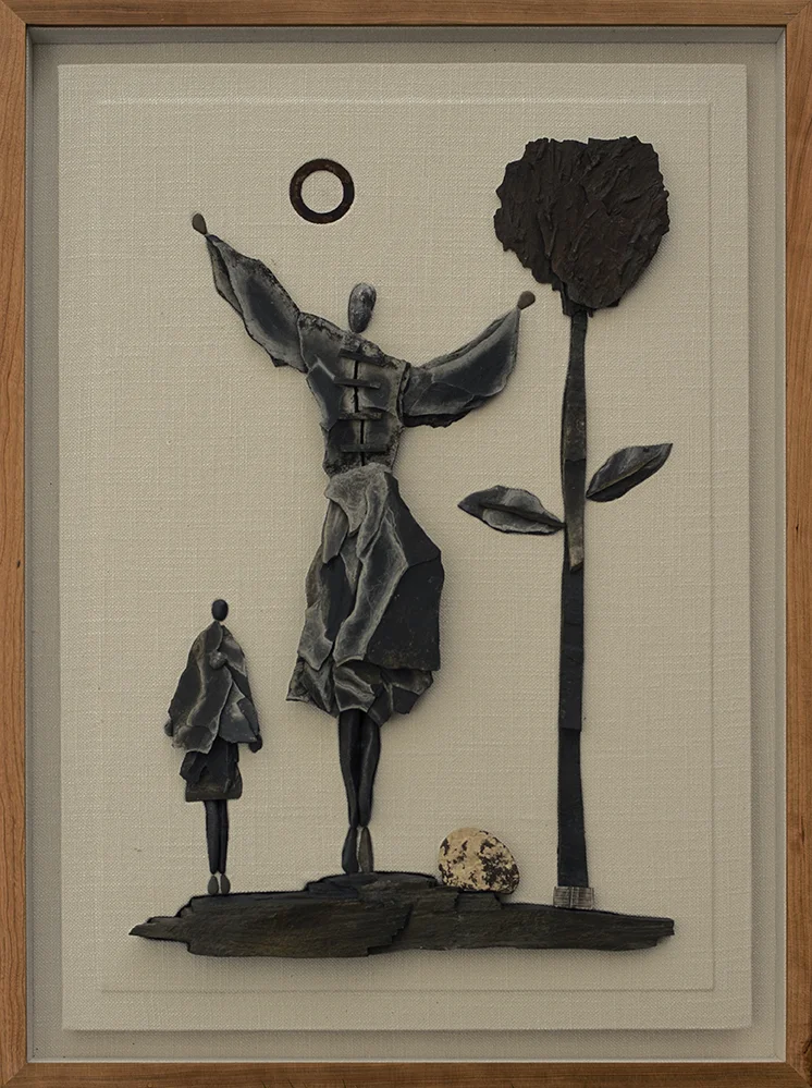 Perennial Flowering (Stone, fossils, found metal, and linen in a lined cherry wood shadowbox)
