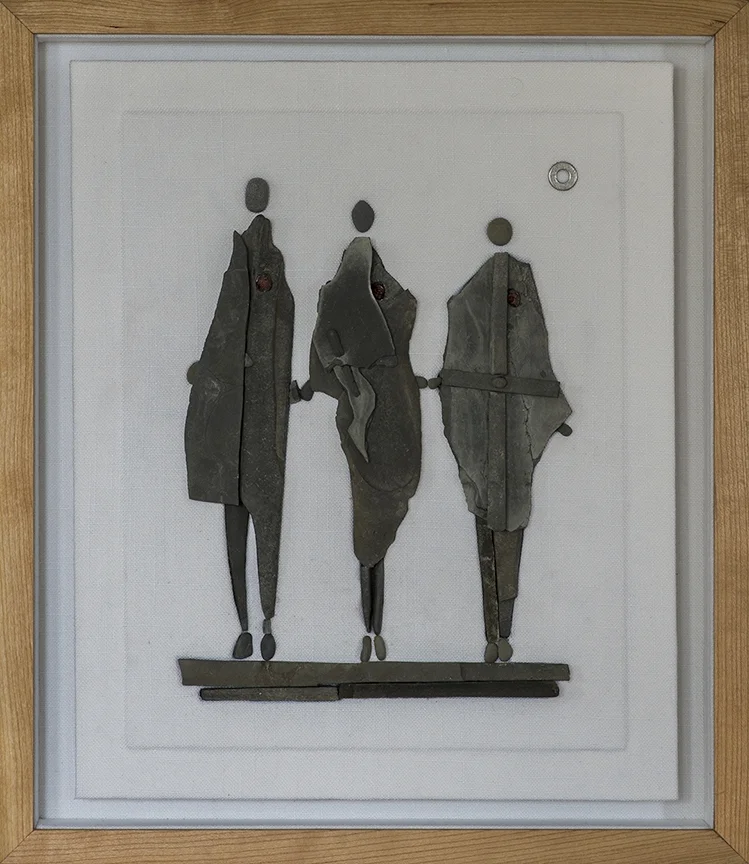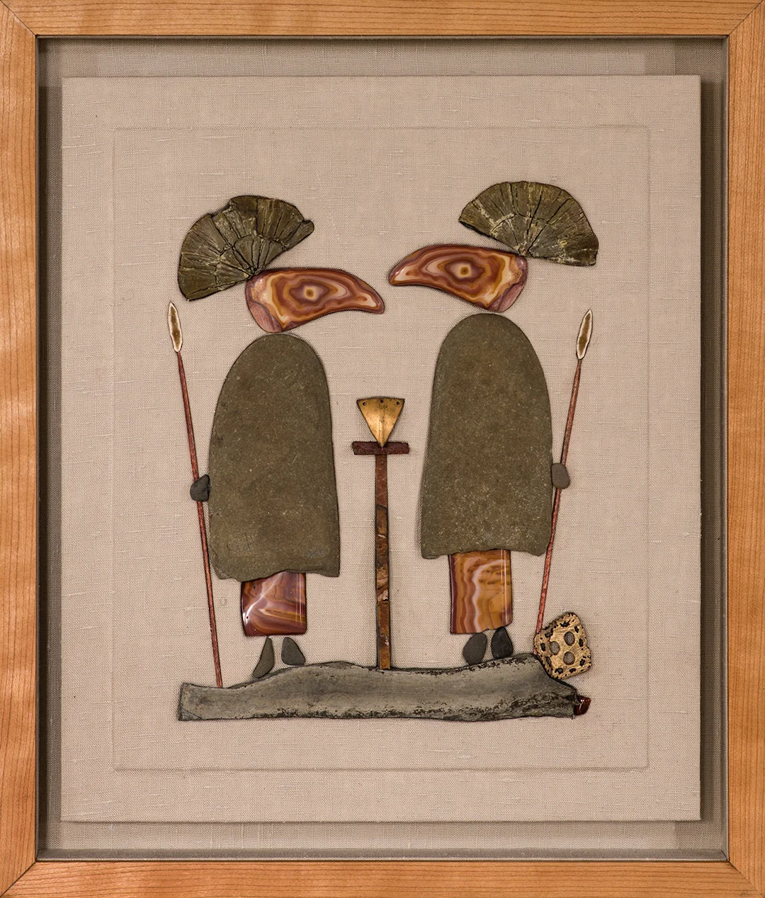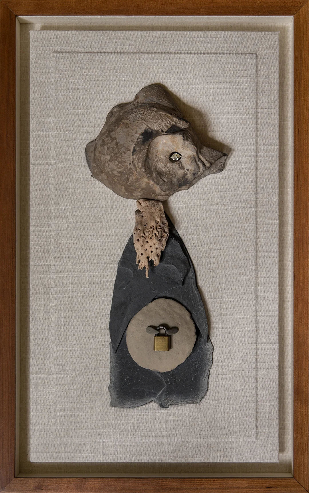 Stone, driftwood, metal, Brazilian topaz, and linen in a lined cherry shadow box (24 3/8" x 15 1/4")