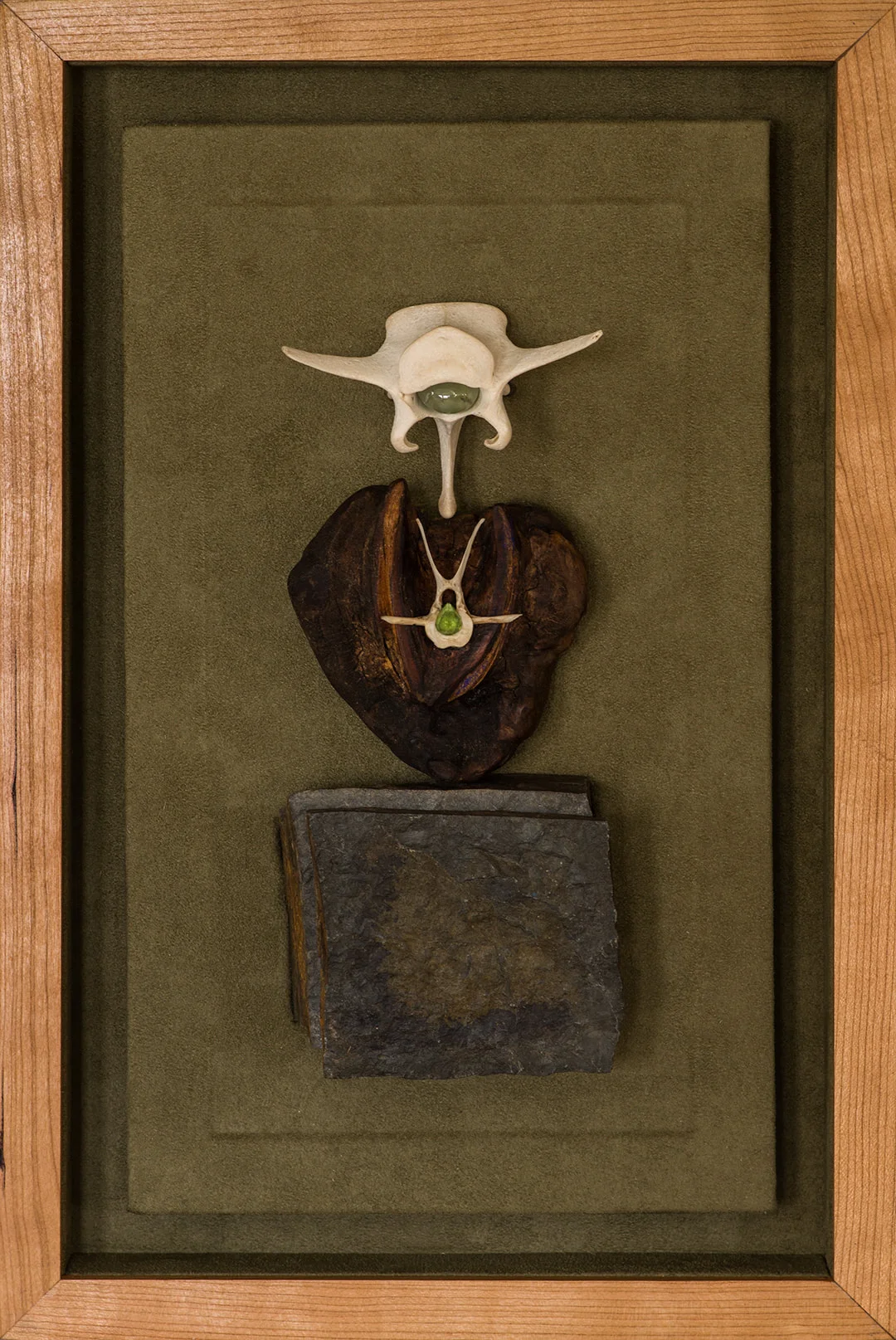 Stone, wood, prehnite, and Arizona peridot in a lined cherry shadow box (16 3/4" x 11")