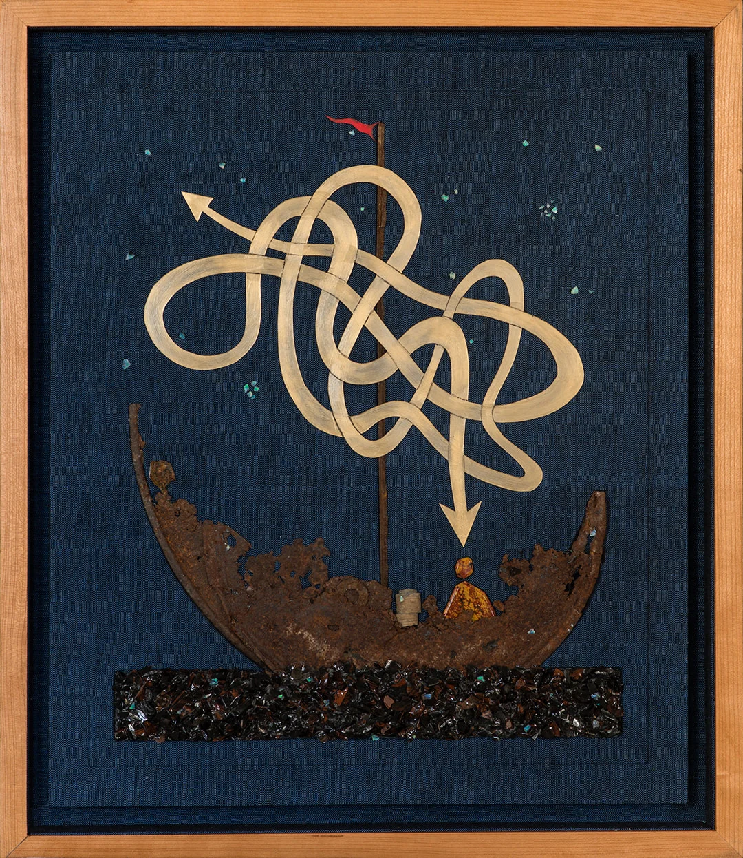 Rusted vehicular droppings, obsidian fragments, painted Yupo paper, ocean jasper, crinoid fossil, crushed opals, and linen, in a lined cherry shadow box. (23 3/4" x 20 3/4")